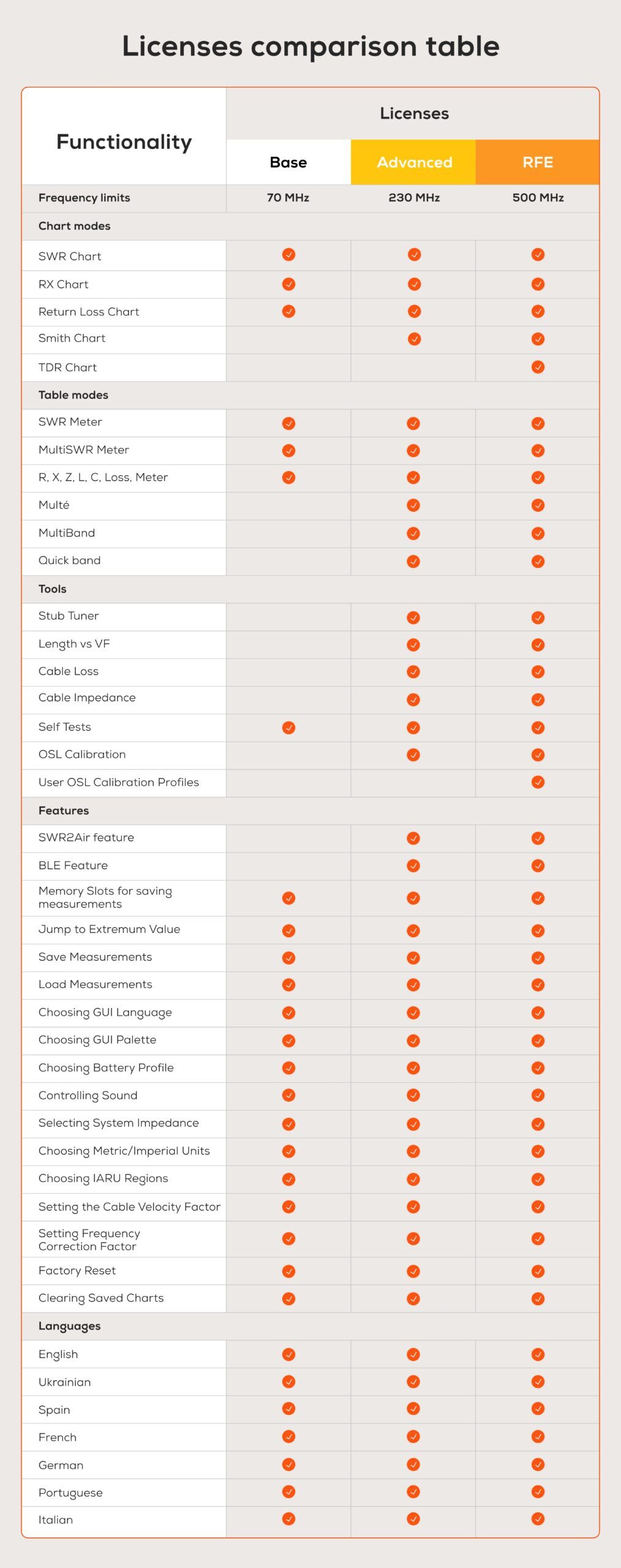 Возможность расширения рабочего диапазона до 0,1-230 МГц (версия ADVANCED) или до 0,1-500 МГц (Версия RFE) путем приобретения дополнительной лицензии.