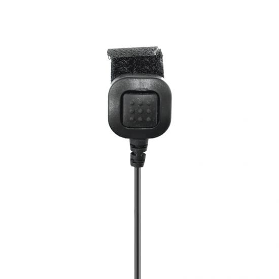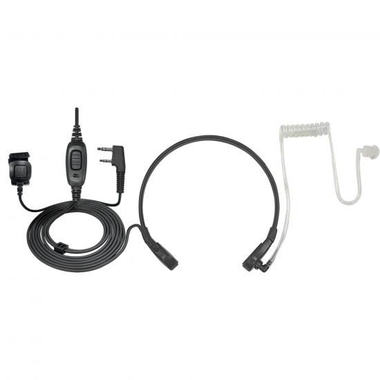 Ларингофонная гарнитура снимает звук непосредственно с голосовых связок на шее с помощью микрофона; имеет выносную кнопку РТТ, крепящуюся на палец при помощи специальной липучки; обладает высокой чувствительностью, что делает возможным использование функции голосового управления передачей VOX; имеет прозрачный малозаметный звуковод. За счет того, что звук подводится по звуководу непосредственно в ухо оператору, обеспечивается защита принимаемой информации от подслушивания посторонними.